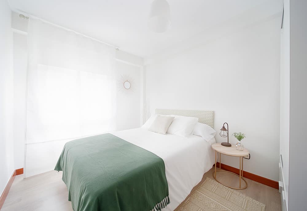 En el caso de la habitación reservamos el cabecero y el armario, ya que nuestra pretensión siempre es abaratar los costes lo máximo posible. Siempre utilizamos colores blancos y decoraciones neutras que provocó que nuestra clienta se enamorara de su inmueble.