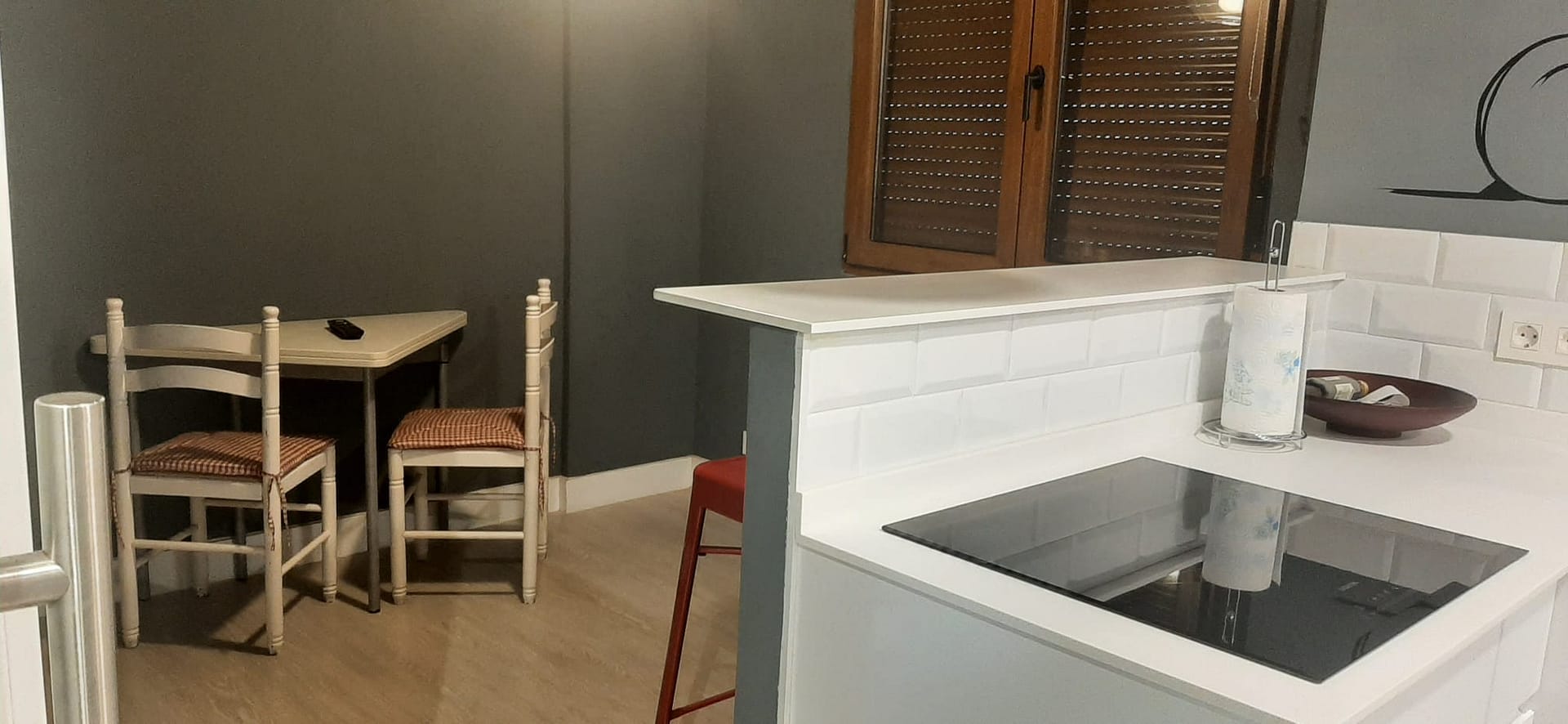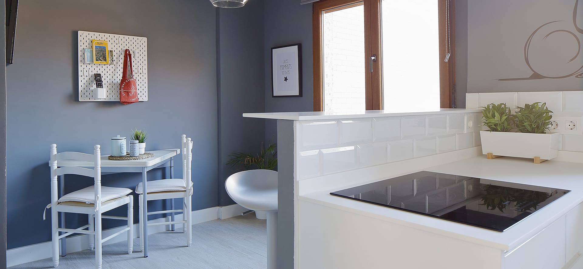 Seguimos la misma estrategia en la cocina, y es que la foto que se estaba enseñando mostraba una estancia cerrada, con una ventana que parecía ocultar algo con las persianas bajadas. Le dimos un añadido a la mesita y le agregamos esa sensación de bienestar que le faltaba.
