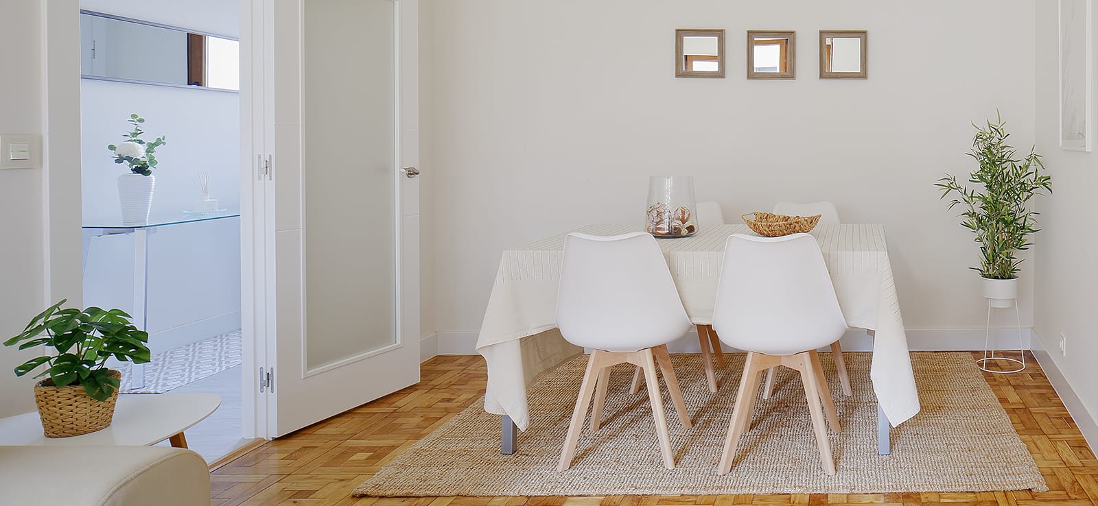 Vestimos la mesa con un mantel, y agregamos una alfombra de yute bajo la mesa que ayuda a crear un ambiente más acogedor.