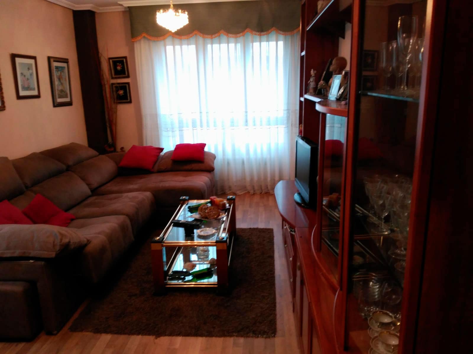 Comenzando por el salón, nos encontramos con dos muebles que ocupan gran parte de la estancia, y que además son de tonos muy oscuros, por lo que no crea contraste y vuelve a esta parte de la vivienda una zona realmente oscura y sin color. Conservamos los muebles, recortando el más grande donde se coloca la televisión, y renovando los textiles por unos mucho más claros.