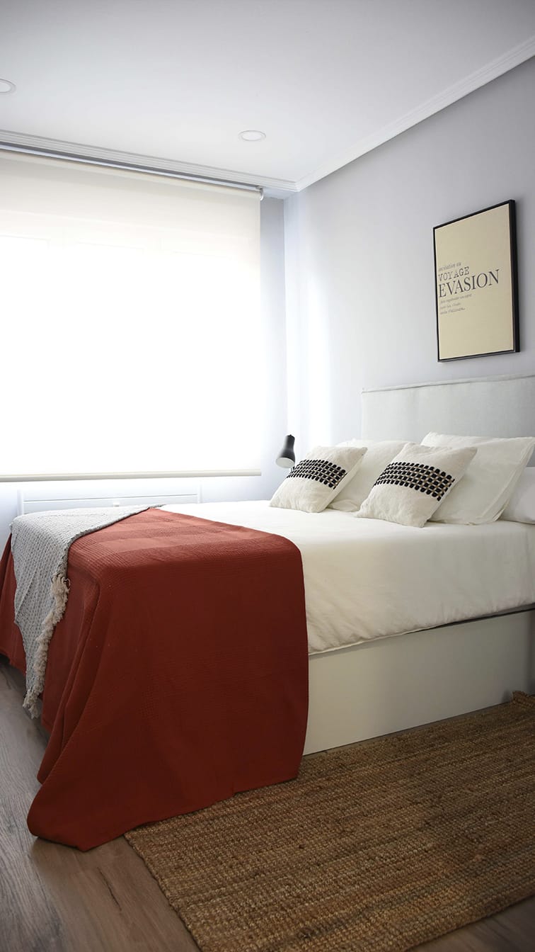 Una de las bases fundamentales del Home Staging consiste en despejar y despersonalizar, así que tras limpiar, pintamos las paredes en blanco y agregamos una ropa de cama totalmente nueva. Con estos detalles, y un suelo completamente cambiado, logramos un ambiente mucho más acogedor gracias a la luz natural que entra por la ventana y a la neutralidad de los colores que hemos utilizado tanto en cojines como en el resto de la estancia al suprimir los cuadros.