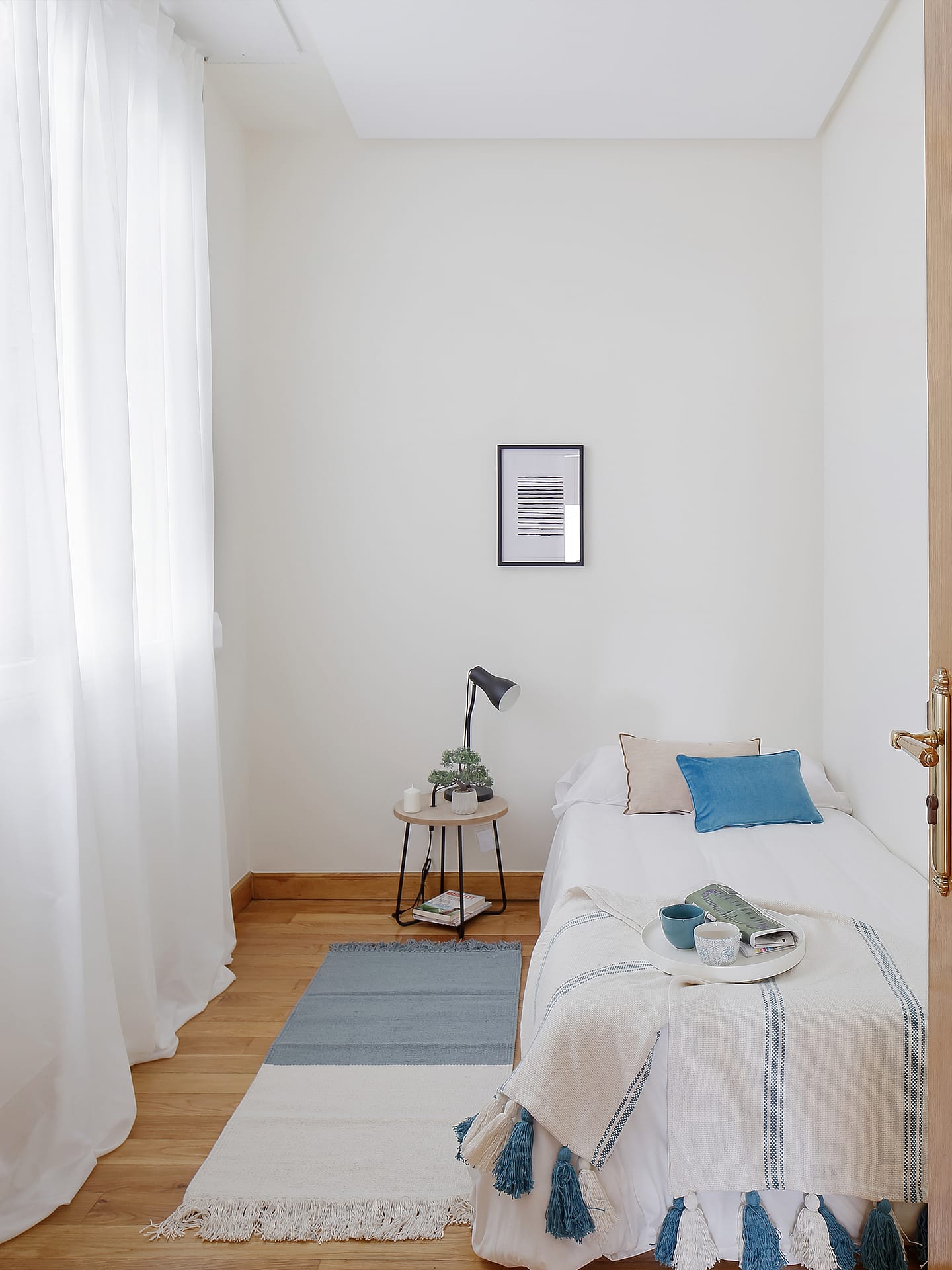Gracias al home staging conseguimos dar sentido a los espacios más pequeños para atender las necesidades vitales. En el caso de la habitación más pequeña, logramos introducir una cama de 1.90 y un escritorio de trabajo, sin saturar el lugar, y creando un ambiente totalmente fluido y espaciado.
