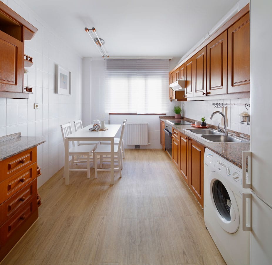 En la cocina teníamos un azulejo muy antiguo, anticuado, y con falto de gusto. Revestimos: cambiamos el suelo, la pared, cambiamos la mesa, y mantuvimos el resto de la cocina.